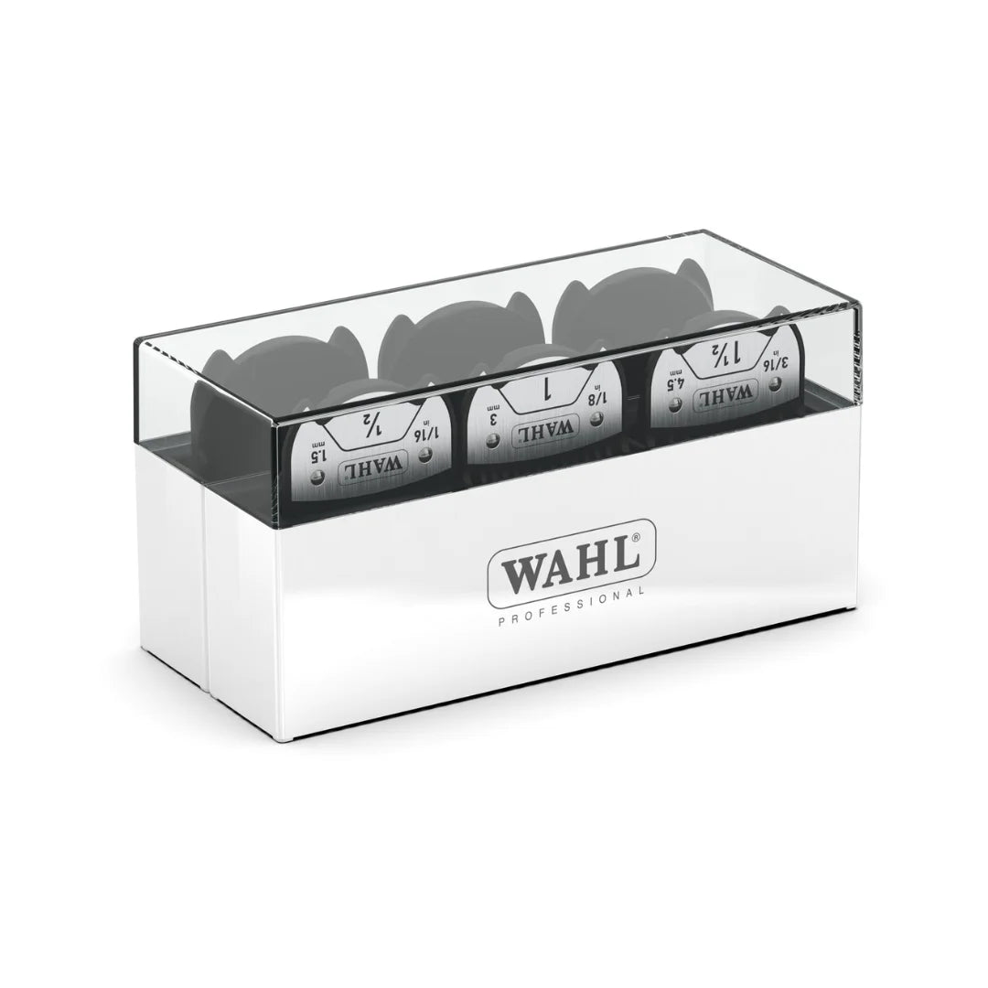 Премиум комплект от 6 магнитни приставки в елегантна кутия, осигуряващи гъвкавост и удобство при работа. Подходящи за модели WAHL Kuno, ChromStyle, Genio и Beretto.